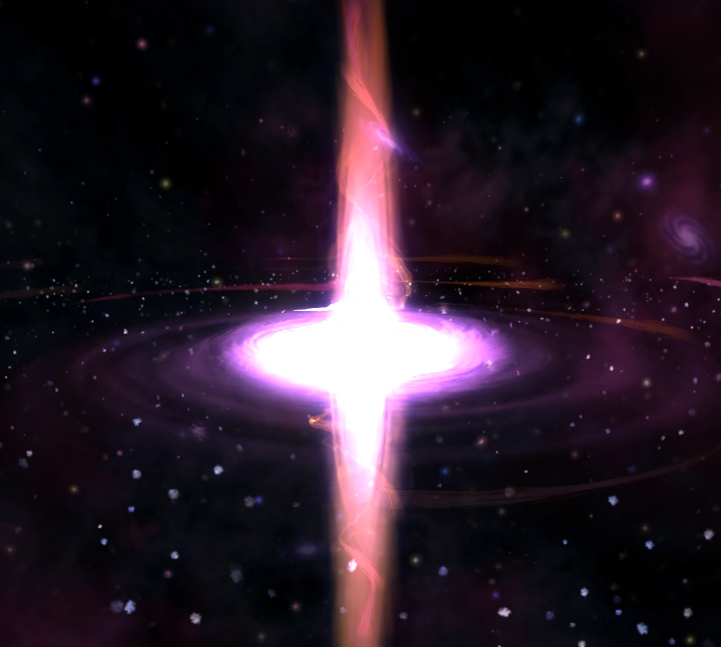 The core is a supermassive black hole with two extremely large jets of gamma rays shooting out of its poles. The pointer on your travel range will go haywire, pointing in various directions as it spins around (The arrow is meant to point to the core itself, so naturally, it acts strange when you are actually there). Once you enter, a deep voice will begin to talk to you, congratulating you on your journey. At the same time, you are traveling through a large wormhole that shares striking features with the star gate in 2001, A Space Odyssey. A closer look reveals that those colors are actually llamas. Once you are through with your journey, you will be met by Steve, who gives you the Staff of Life. You also receive the Galactic Core, Talked to Steve Rare, and the 42 achievement. Once out of the core, your travel radius will return to normal. Despite what Steve tells you, when you go to Earth there will be no presentation or a free breakfast. For those who have not allied with the Grox, their homeworld is right next to the core, and is one of the few Grox worlds which can be captured without luck, a trade route, or Fanatical Frenzy. The reason the Grox attack you when you head towards the Galactic Core is possibly because once you get there, Steve will give you the Staff of Life. Since the Grox cannot live on any planet with a T-score of 1 or higher, and the Staff of life instantly brings the T-score to T3, the Grox do not want anyone to get to the Core.